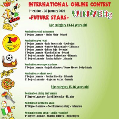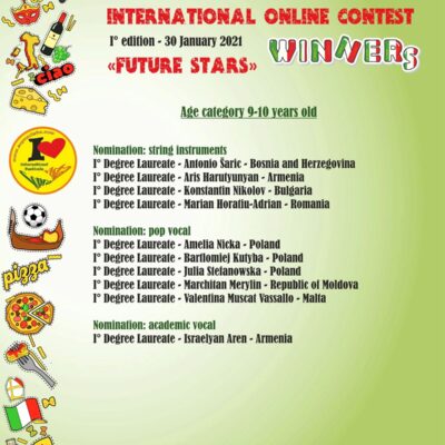 W I edycji tego Międzynarodowego Konkursu Online, zatytułowanego, „Przyszłe gwiazdy, oprócz młodych artystów m.in.  z Włoch, Armenii, Bułgarii, Malty, wzięli  także udział uczniowie Szkoły Podstawowej w Lutomi Dolnej- Bartłomiej i Klaudia Kutybowie, którzy zdobyli I miejsca w swoich kategoriach wiekowych- 9-10 lat oraz 13-14 lat.