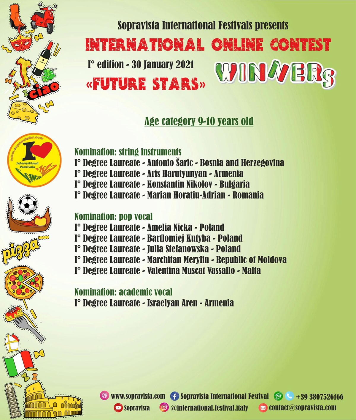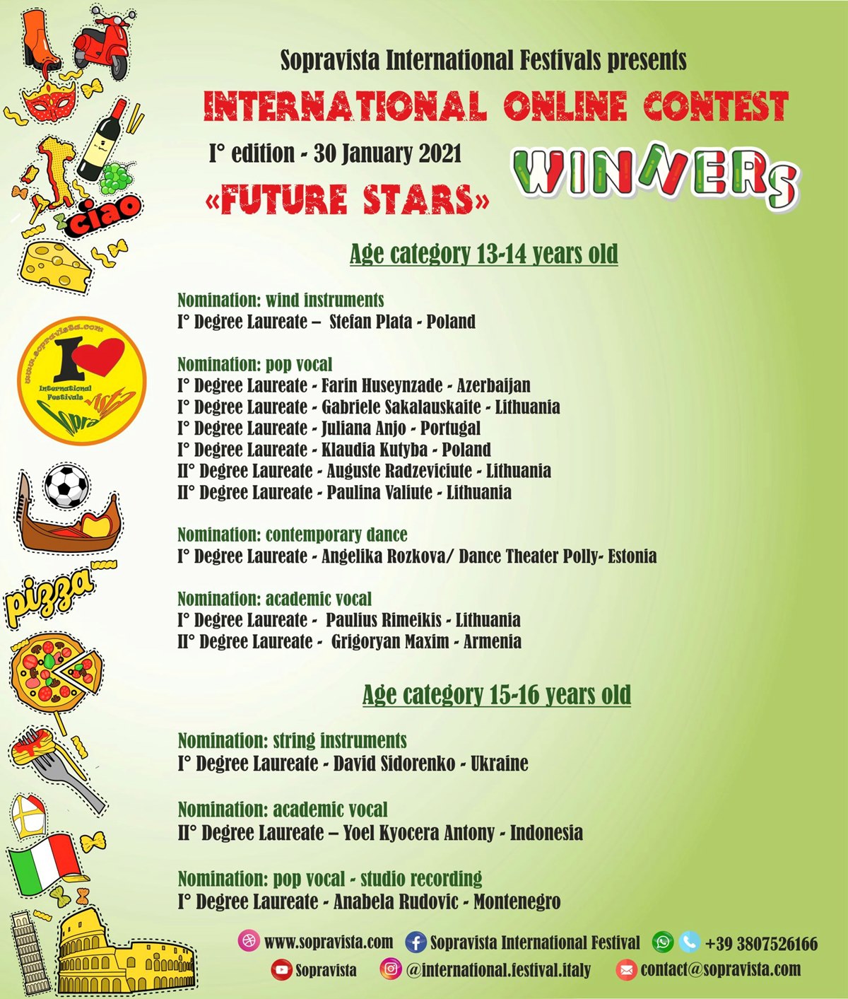 „Sopravista International Festivals” to włoska organizacja artystyczna, która  corocznie organizuje międzynarodowe festiwale i konkursy, w których uczestnicy z całego świata mają możliwość pokazania talentu i wyobraźni, swoich umiejętności i wyników pracy, zaspokojenia potrzeb twórczego wyrażania siebie i rozwoju estetycznego.