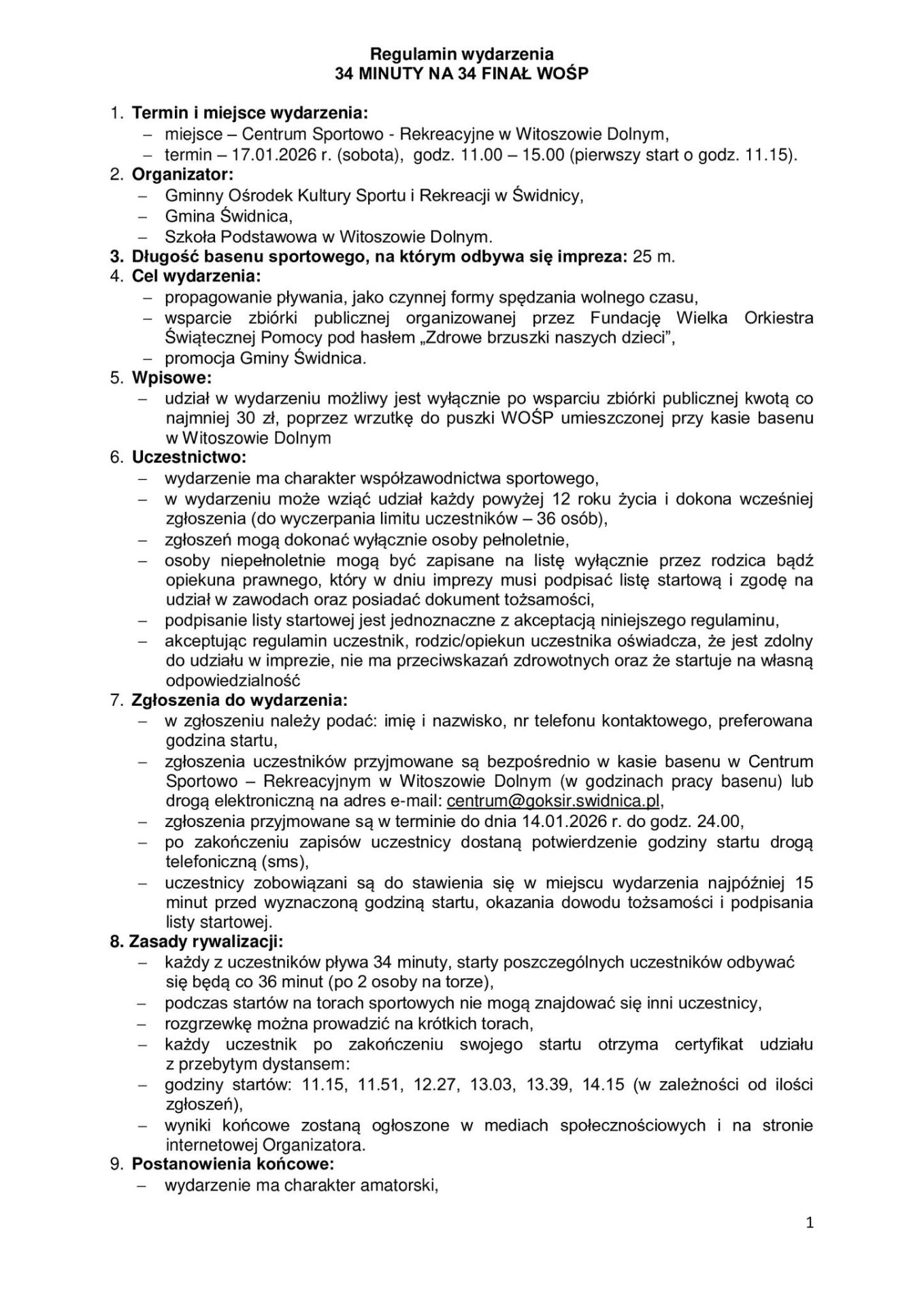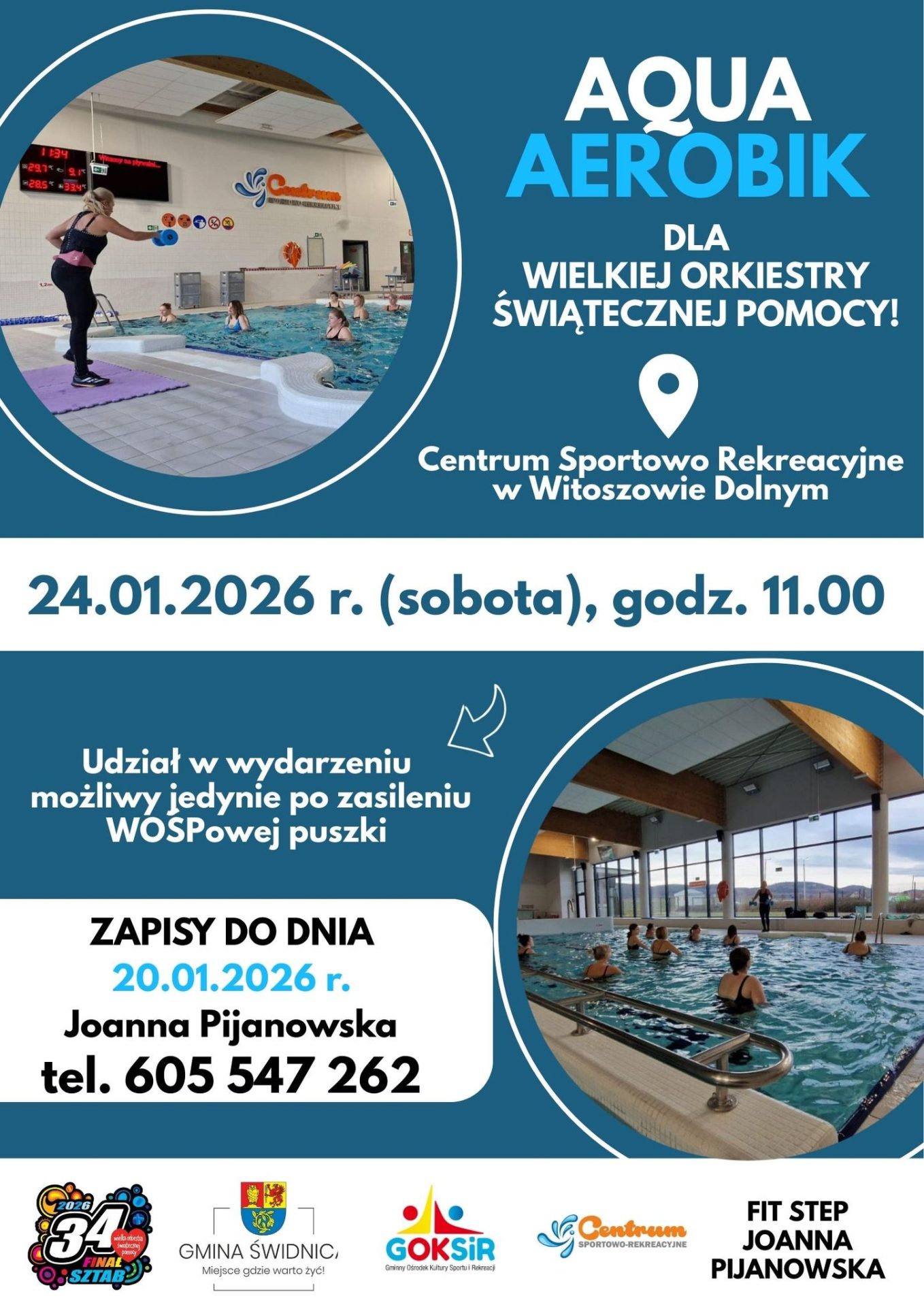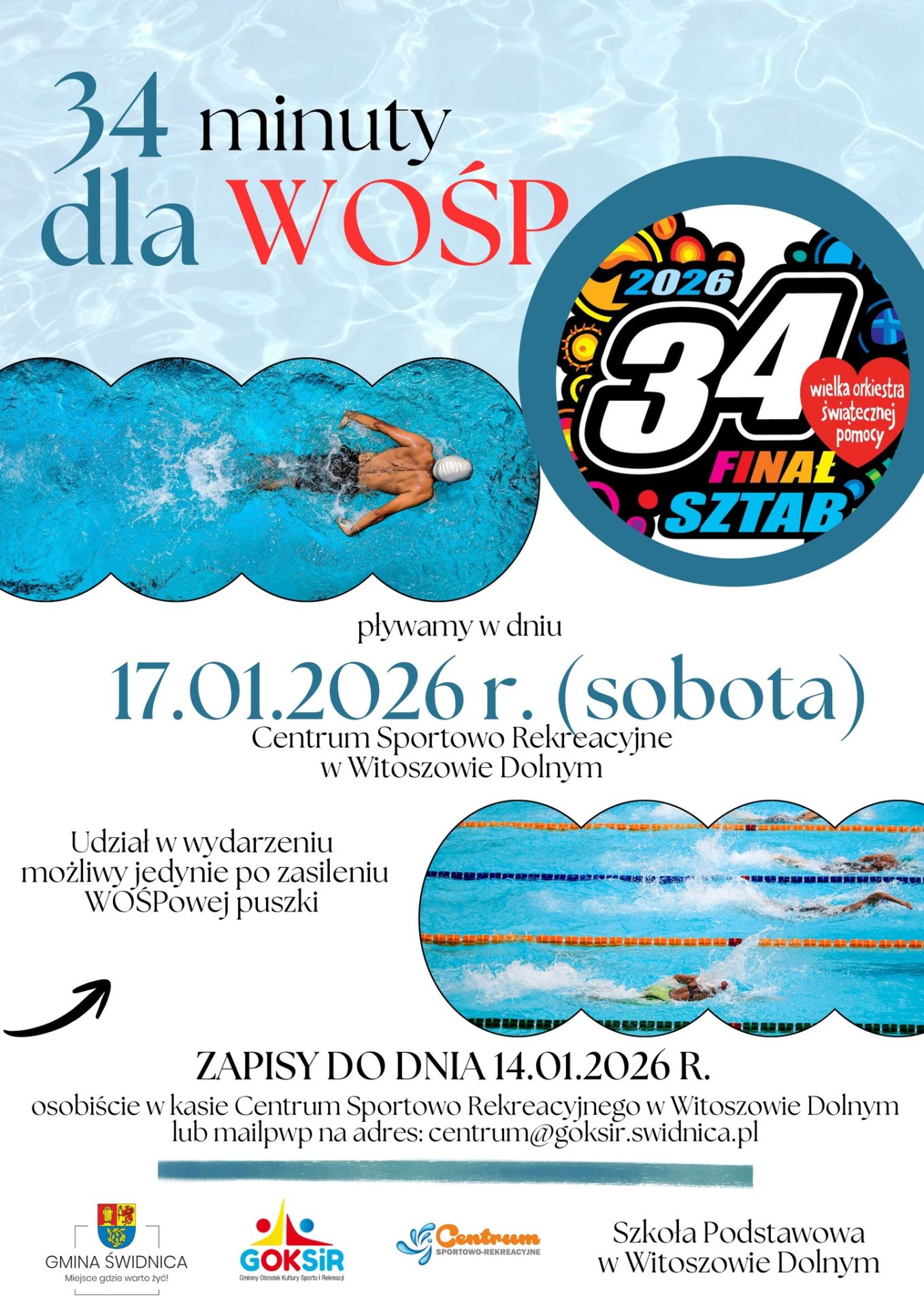 17 stycznia 2026 r. (sobota) zapraszamy na wyjątkowe wydarzenie sportowe w ramach 34. Finału Wielkiej Orkiestry Świątecznej Pomocy! Spotykamy się w Centrum Sportowo-Rekreacyjnym w Witoszowie Dolnym i razem płyniemy dla celu