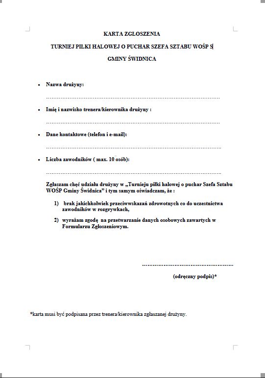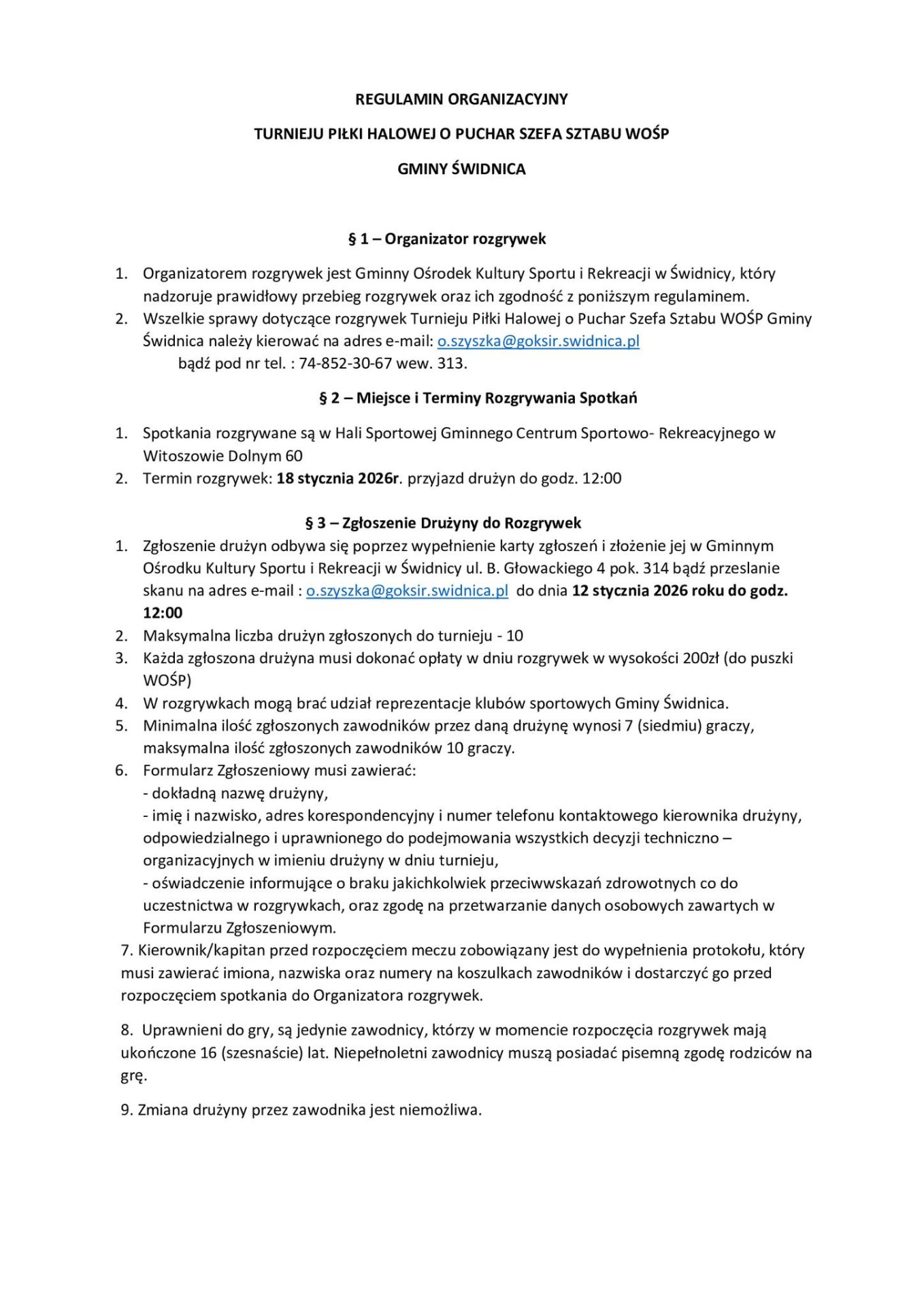 Zapisy prowadzone są do 14 stycznia br. lub do wyczerpania miejsc. Zgłoszenia tel./SMS: 793 339 611 – Wioleta Wasylko e-mail: a.maslyk@goksir.swidnica.pl (w zgłoszeniu: nazwa drużyny, imiona i nazwiska zawodników, daty urodzenia, numery kontaktowe). Gwarantujemy sportowe emocje, świetną atmosferę i ogromną dawkę dobra!
