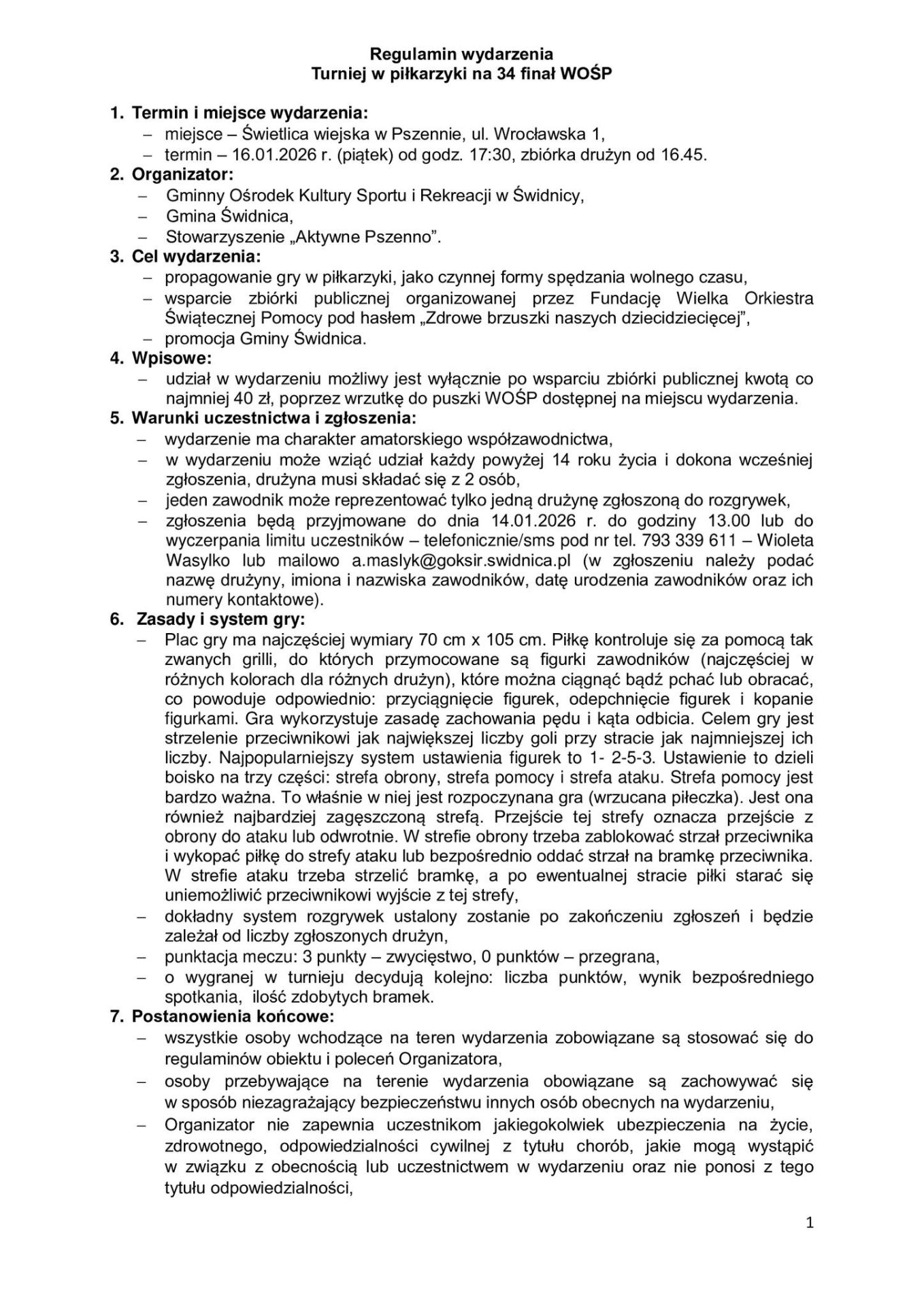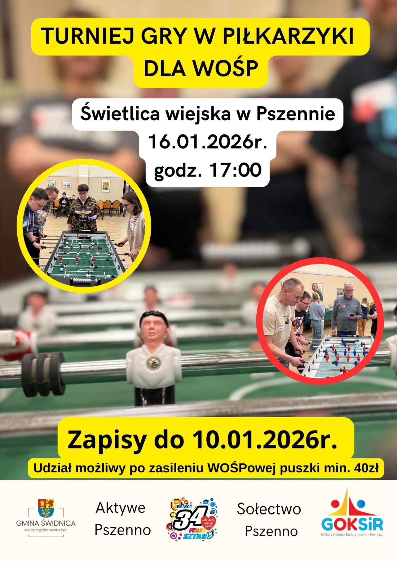 W piątek, 16 stycznia 2026 r. zapraszamy na świetlicę w Pszennie przy ul. Wrocławskiej 1. Start turnieju został zaplanowany na godz. 17:30. Zbiórka drużyn od godz. 16:45.