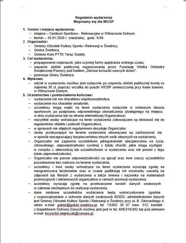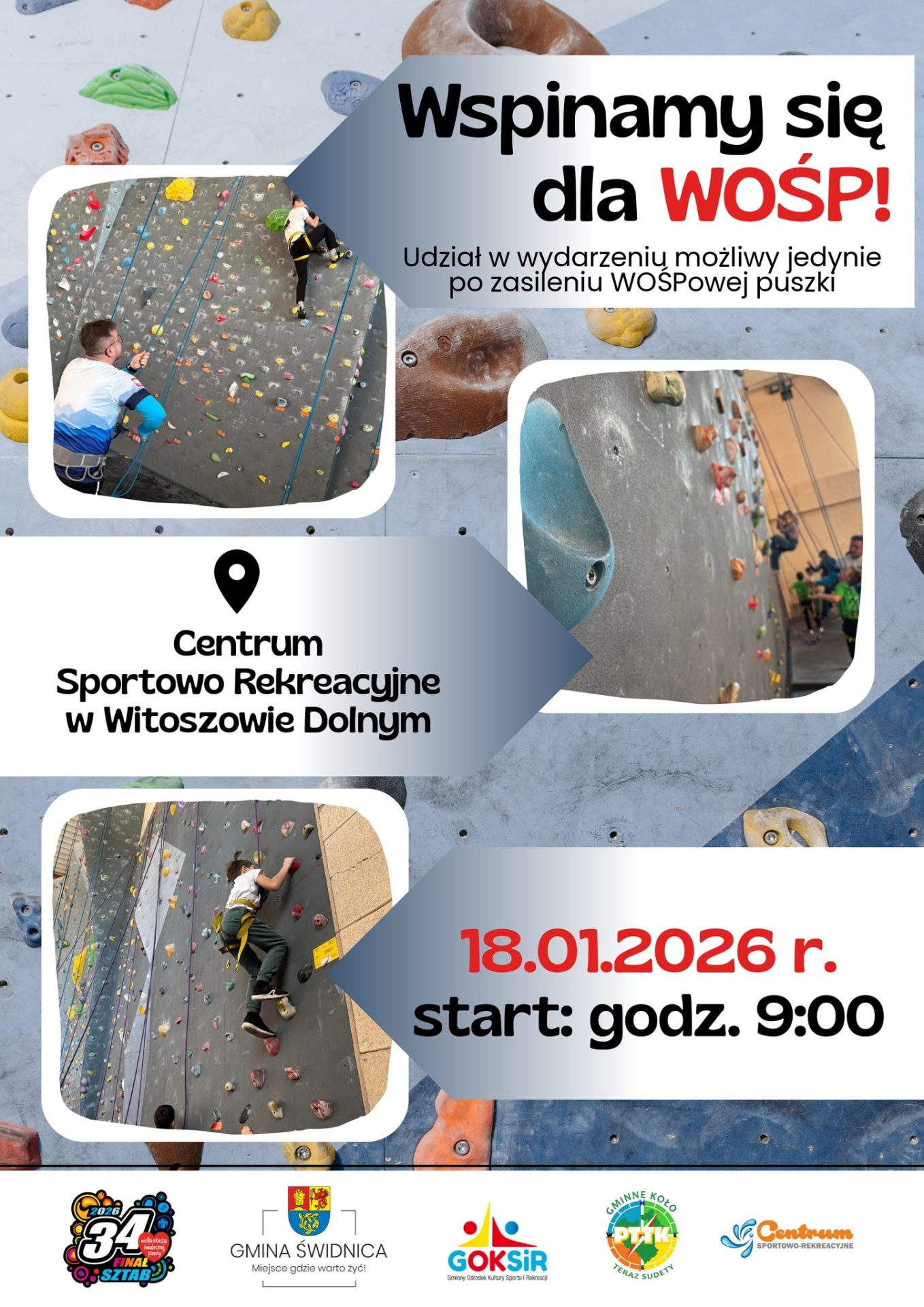 18 stycznia 2026 roku o godz. 11:00 w Centrum Sportowo-Rekreacyjne w Witoszowie Dolnym wspinamy się dla WOŚP.