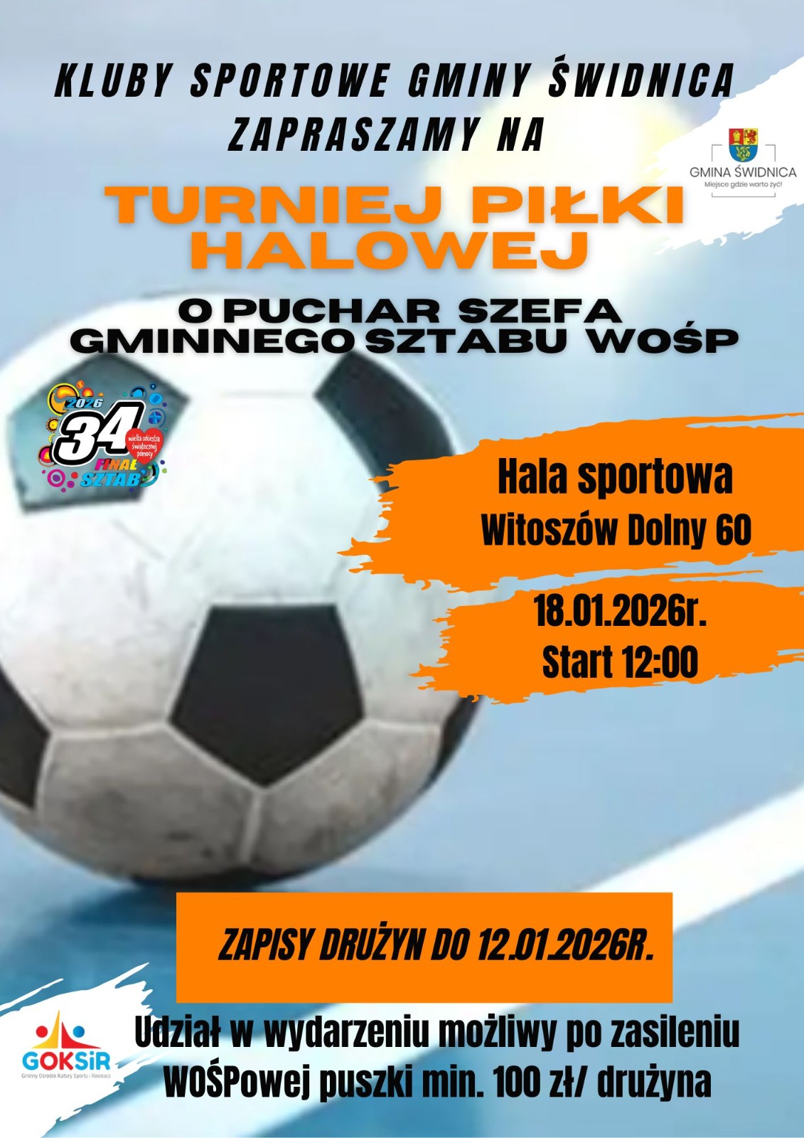 18 stycznia 2026 r. gramy razem dla WOŚP i zapraszamy wszystkie sportowe drużyny z terenu gminy Świdnica do udziału w wyjątkowym turnieju piłki halowej! To idealna okazja, by połączyć rywalizację sportową z pomaganiem. Na przyjazd drużyn w hali sportowej Gminnego Centru Sportowo-Rekreacyjnym Przyjazd oczekujemy do godz. 12:00.