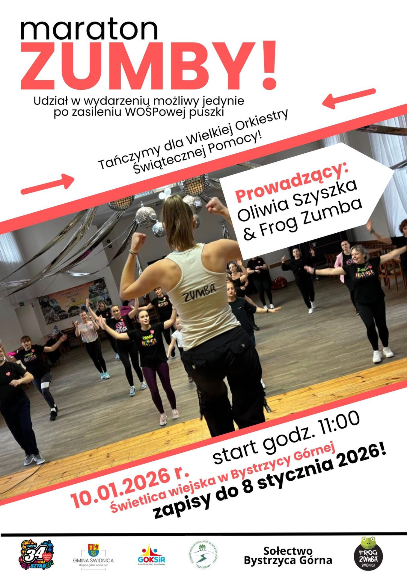 Połącz ruch, dobrą energię i pomaganie. Już 10 stycznia 2026 r. godz. 11:00 w Bystrzycy Górnej odbędzie się wyjątkowy maraton Zumby dla Wielkiej Orkiestry Świątecznej Pomocy. Dla kogo? Dla wszystkich od 16. roku życia (liczba miejsc ograniczona – 60 osób!)