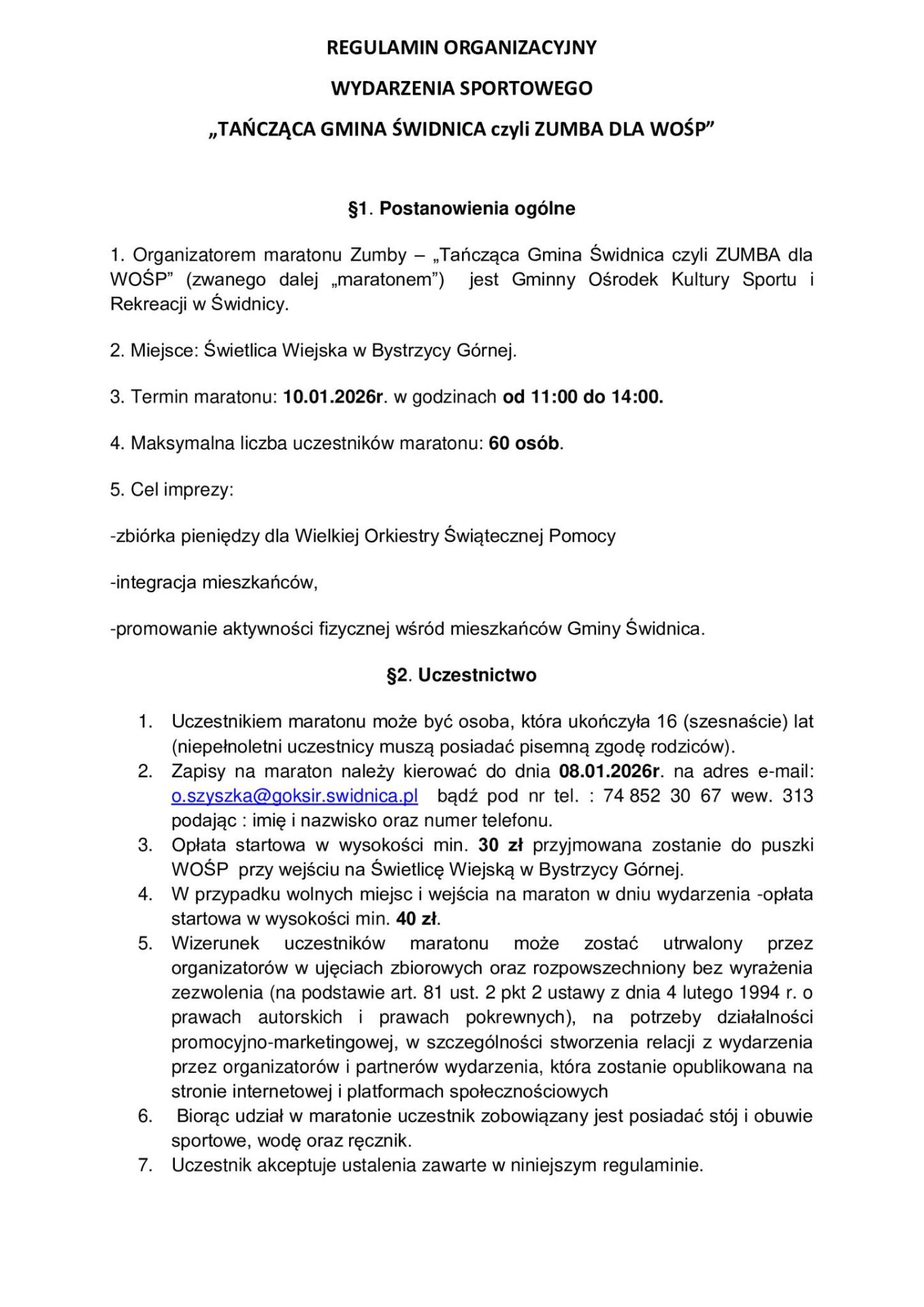 Zapisy do 8.01.2026 r. prowadzone są za pośrednictwem korespondencji e-mail: o.szyszka@goksir.swidnica.pl lub tel.: 74 852 30 67 wew. 313 (w zgłoszeniu prosimy o podanie danych tj. imię, nazwisko i numer telefonu). Zabierz ze sobą strój sportowy, obuwie, wodę i ręcznik – resztę zapewni dobra energia i wspólny cel!