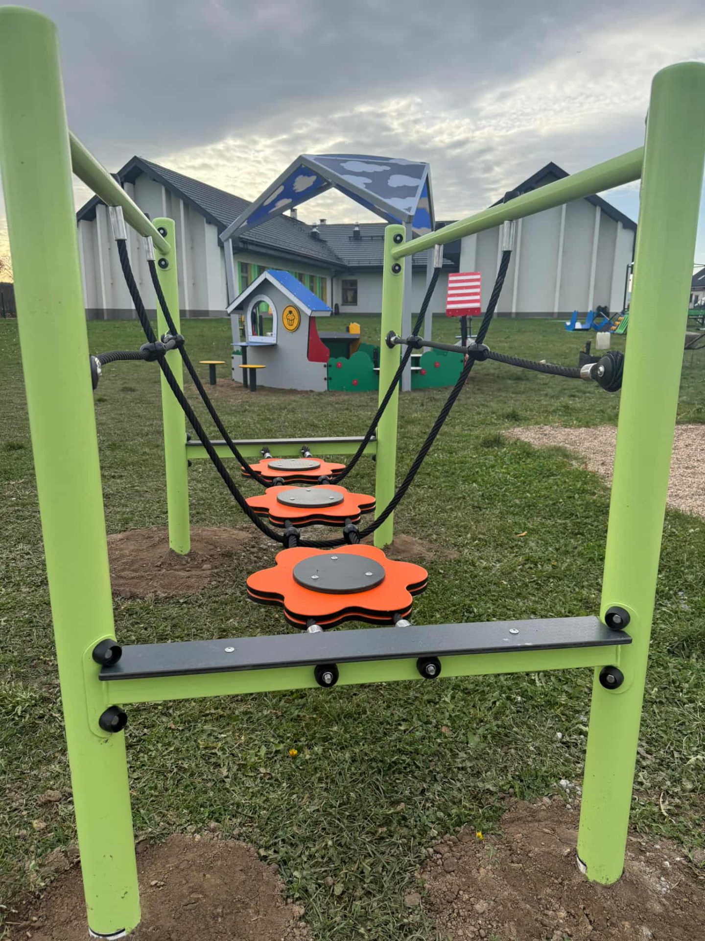 - równoważnia modułowa, mostek kwiatowy oraz wieloelementowy zestaw zabawowy rozwijają siłę, zwinność, poczucie równowagi i odwagę w pokonywaniu przeszkód;