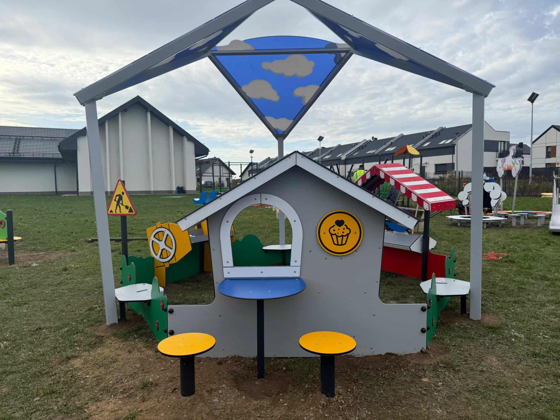 - zadaszona piaskownica z blatami do siedzenia i trzema strefami tematycznymi oraz kącik kuchenny pobudzają wyobraźnię, kreatywność i zabawę w odgrywanie ról;