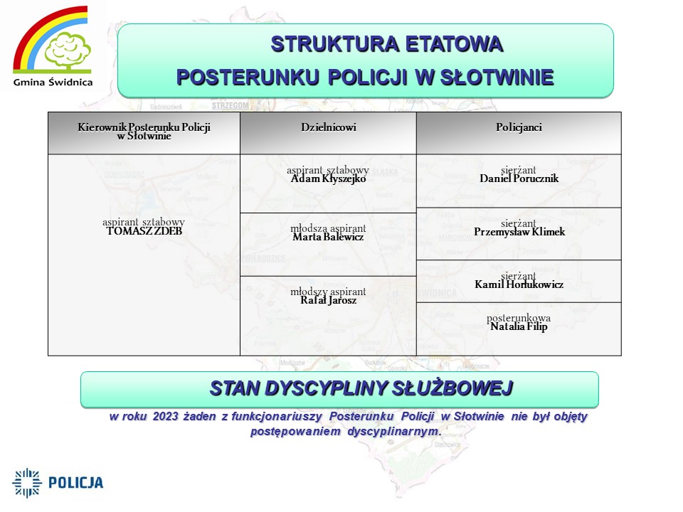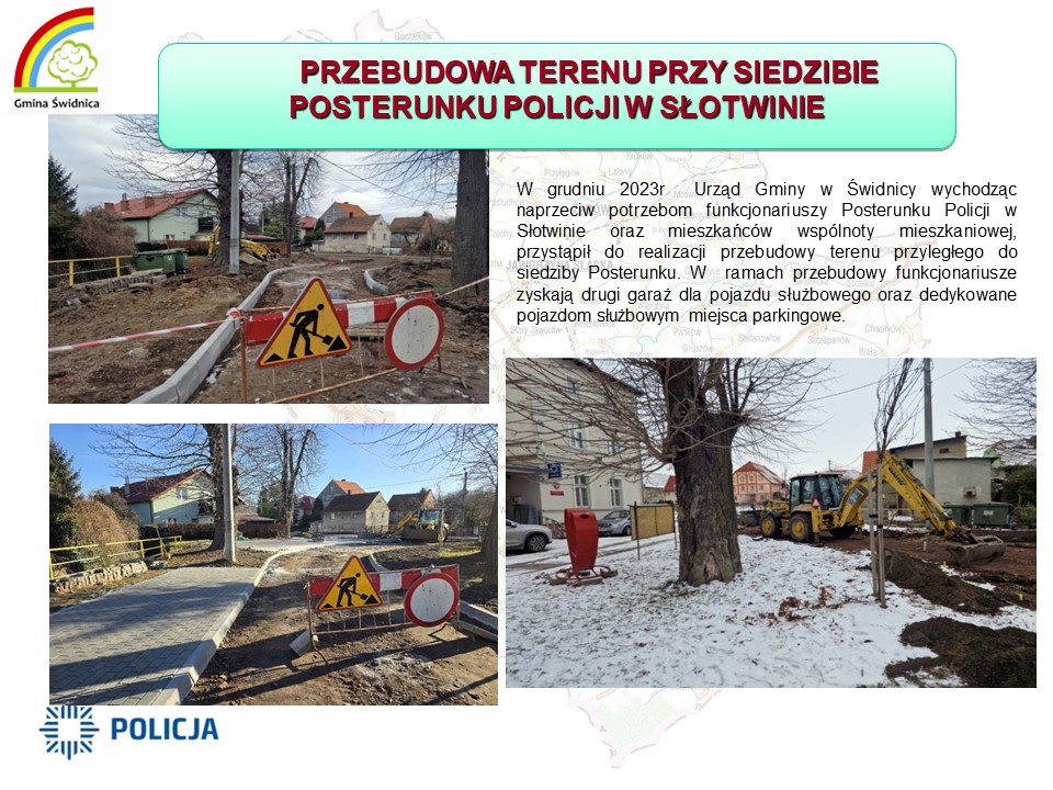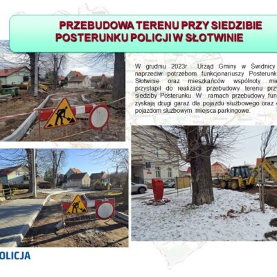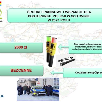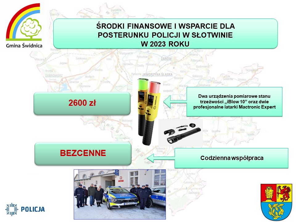 Zastępca Komendanta Powiatowego Policji w Świdnicy mł. insp. Przemysław Siwiak oraz kierownik Posterunku Policji w Słotwinie asp. sztab. Tomasz Zdeb wyrazili słowa uznania przedstawicielom samorządu gminy Świdnica za wsparcie policji, co przekłada się na poprawę warunków pracy funkcjonariuszy. Szczególnie podziękowania dla Pani wójt Teresy Mazurek, za wspólną służbę na rzecz społeczności gminy, za zawsze pozytywne podejście do łączących nas spraw w zakresie bezpieczeństwa publicznego – mówił astp. Sztab. Tomasz Zdeb.