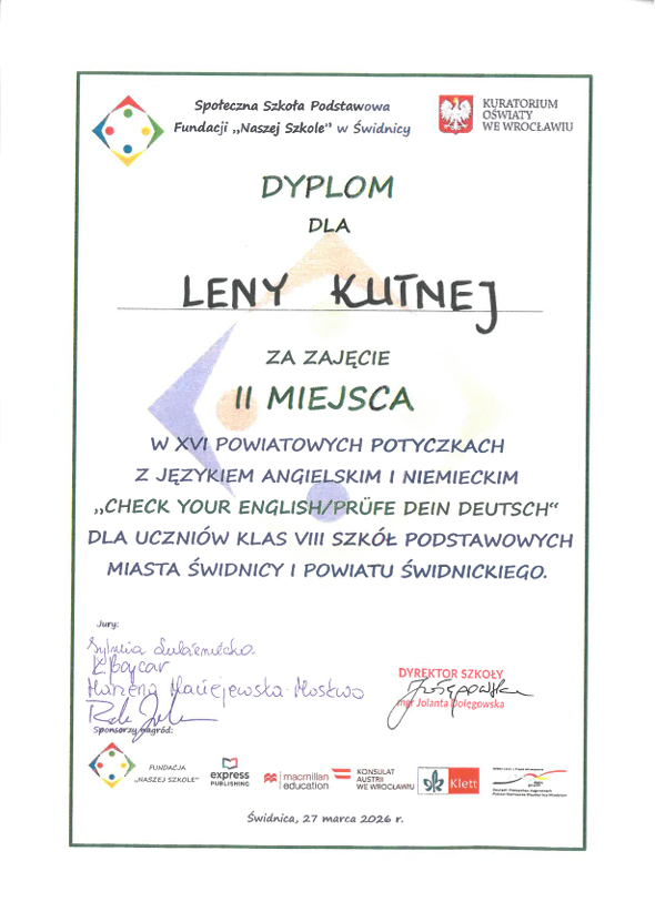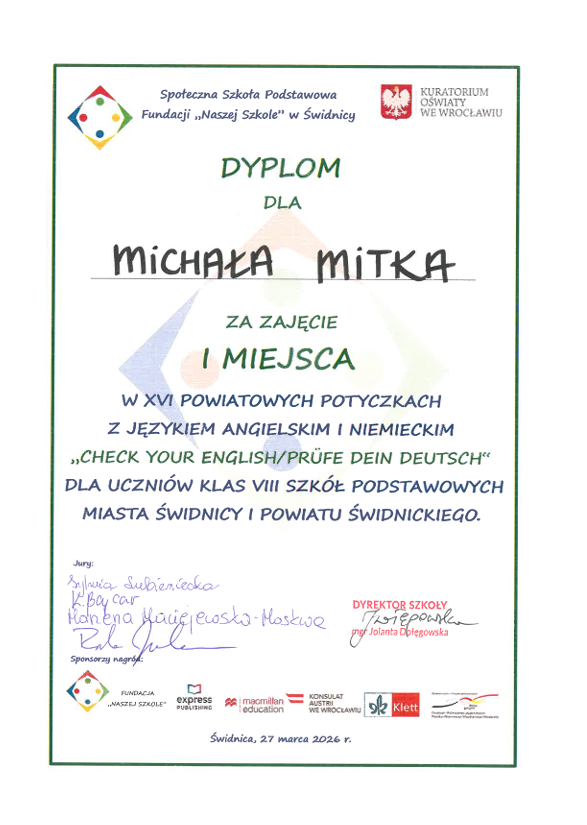 Konkurs był doskonałą okazją do sprawdzenia umiejętności językowych oraz rywalizacji z uczniami z innych szkół. Michał i Lena wykazali się bardzo wysokim poziomem znajomości języka angielskiego i niemieckiego, osiągając znakomite wyniki. Laureaci konkursu otrzymują dodatkowe punkty w procesie rekrutacji do szkół ponadpodstawowych.